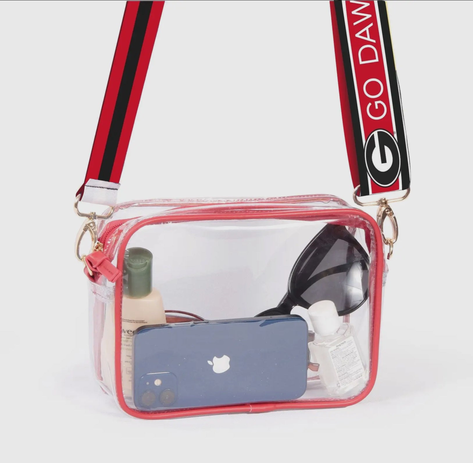 👏 Desden Bridgette Clear Purse - From the stadium to the street, she’ll take her Georgia Bulldogs pride everywhere with The Bridget, a stylish clear purse boasting an exclusive printed Game Day strap. The purse is crafted of clear vinyl and soft vegan leather, featuring brass hardware accents. It is sized to be stadium approved at 8" x 6" x 2" and includes 2 adjustable purse straps for changing up her look in a snap.