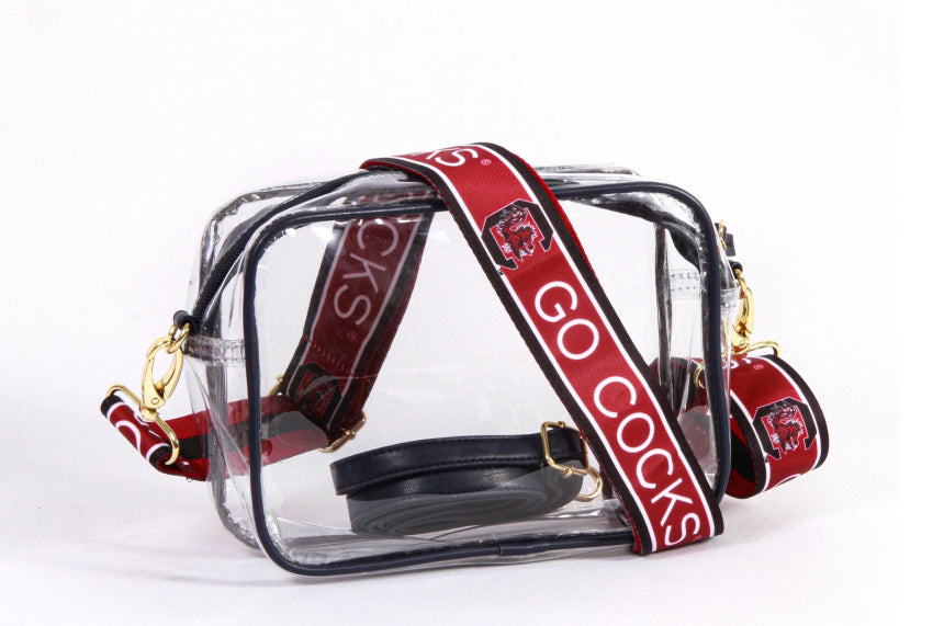 👏 Desden Bridgette Clear Purse - From the stadium to the street, she’ll take her USC Gamecocks pride everywhere with The Bridget, a stylish clear purse boasting an exclusive printed Game Day strap. The purse is crafted of clear vinyl and soft vegan leather, featuring brass hardware accents. It is sized to be stadium approved at 8" x 6" x 2" and includes 2 adjustable purse straps for changing up her look in a snap.